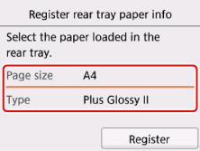 Виберіть розмір і тип завантаженого паперу в задньому лотку в розділах Розм. ст. (Page size) і Тип (Type), а потім виберіть пункт Реєстрація (Register).