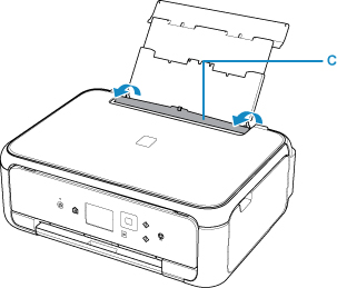 Trượt các thanh dẫn giấy để mở và nạp giấy vào chính giữa khay sau VỚI MẶT IN NGỬA LÊN.