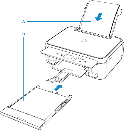 Принтерът има два източника за подаване на хартия – задната тава (A) и касетата (B).