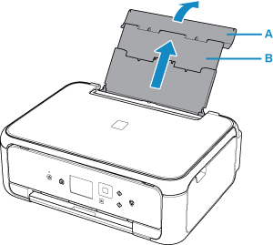 1. Mở nắp khay sau (A) rồi kéo giá đỡ giấy (B) lên.