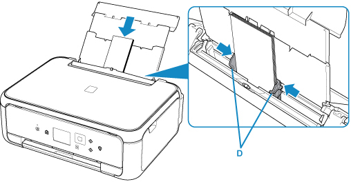 Trượt các thanh dẫn giấy (D) để mở và nạp phong bì vào chính giữa khay sau VỚI MẶT IN NGỬA LÊN.