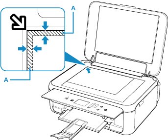 Máy in không thể quét vùng gạch chéo (A) (1 mm (0,04 inch) từ cạnh của màn quét).