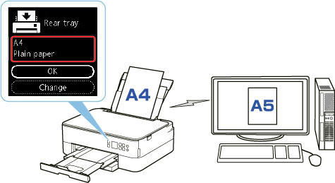 Hvis papirindstillingen til udskrivning f.eks. er A5, og de papiroplysninger, der er registreret for printeren, er A4, begynder printeren at udskrive på det papir, der er lagt i den bagerste bakke eller i kassetten, uden at ændre indstillingen for papirstørrelse til udskrivning.