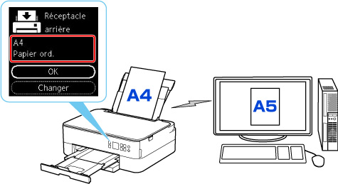 - Par exemple, si le paramètre de format de papier pour l'impression est A5 et que le format de papier enregistré dans l'imprimante est A4, l'imprimante démarre l'impression sur le papier chargé dans le réceptacle arrière ou dans la cassette sans modifier le paramètre de format du papier pour l'impression.