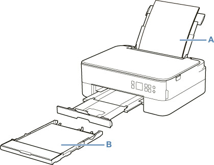 Pencetak memiliki dua sumber kertas untuk menyalurkan kertas, tatakan belakang (A) dan kotak kertas (B).