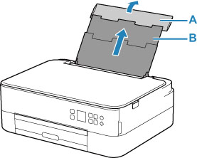 Atidarykite galinio dėklo dangtį (A). Ištraukite ir atlenkite popieriaus atramą (B).
