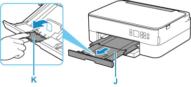 Ištraukite popieriaus išvesties dėklą (J) ir atidarykite popieriaus išvesties atramą (K).