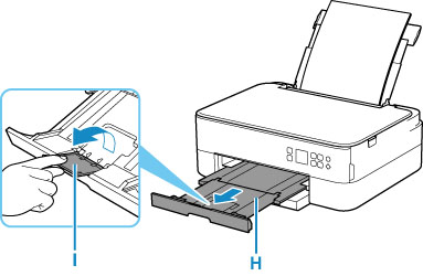 Izvelciet papīra izvades uztvērēju (H) un atveriet papīra izvades atbalstu (I).