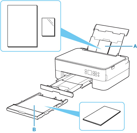 Pisač ima dva izvora papira za ulaganje papira, stražnju ladicu (A) i kasetu (B).