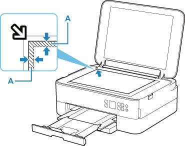 Spausdintuvas negali nuskaityti įstrižai subrūkšniuotos srities (A) (1 mm (0,04 col.) nuo ekspozicinio stiklo kraštų).