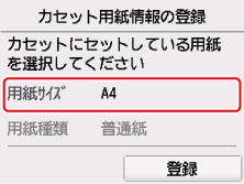 カセットにセットした用紙に合わせて[用紙サイズ]を設定し、[登録]を選ぶ