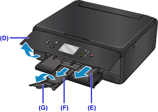 İşletim panelini (D) açın, kağıt çıkış tepsisini (E) ve kağıt çıkış desteğini (F) çekin ve çıkış tepsisi uzantısını (G) açın.