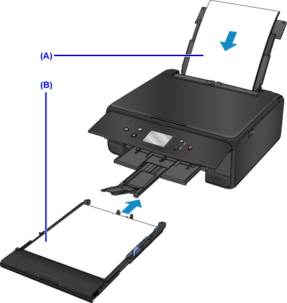 Ο εκτυπωτής διαθέτει δύο προελεύσεις για την τροφοδοσία χαρτιού, την πίσω θήκη (Α) και την κασέτα (Β).