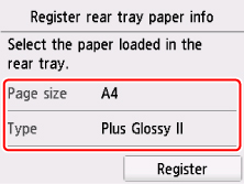 Valige jaotistest L suurus (Page size) ja Tüüp (Type) tagumisele alusele laaditud paberi suurus ja tüüp, seejärel valige Registreeri (Register).