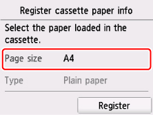 Valige jaotisest L suurus (Page size) kassetti laaditud paberi suurus, seejärel valige Registreeri (Register).