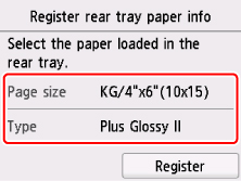 Valige jaotistest L suurus (Page size) ja Tüüp (Type) tagumisele alusele laaditud paberi suurus ja tüüp, seejärel valige Registreeri (Register).