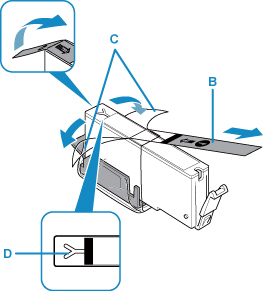 4. Võtke uus tindimahuti pakendist välja, eemaldage täielikult oranž teip (B) ja seejärel kaitsekile (C).