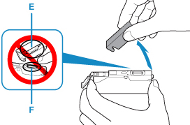 • Ärge puudutage oranži kaitsekorgi (E) sisemust ega avatud tindiava (F). Kui te neid osasid puudutate, siis võib tint teie käsi määrida.