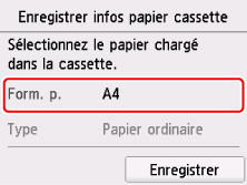 Sélectionnez la taille du papier chargé dans la cassette dans Form. p., puis sélectionnez Enregistrer.