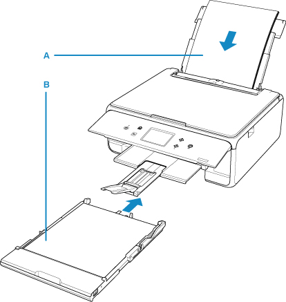 A nyomtató két papírforrásból tudja adagolni a papírt: a hátsó tálcából (A) és a kazettából (B).