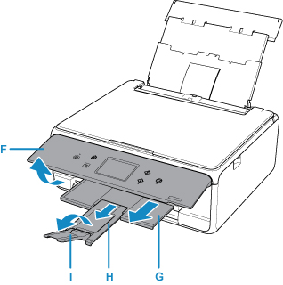 Avage juhtpaneel (F), tõmmake paberi väljastusalus (G) ja paberi väljastuse tugi (H) välja ning avage väljastusaluse pikendus (I).
