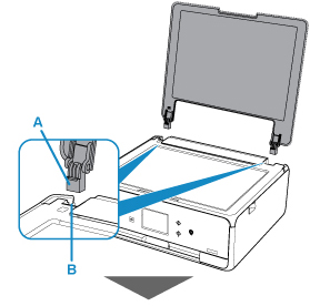 Sobitage dokumendikaane hinged (A) hoidikusse (B) ja sisestage mõlemad dokumendikaane hinged vertikaalselt, nagu näidatud alloleval joonisel.