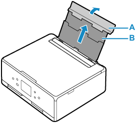 Отворете капака на задната тава (A). Издърпайте право нагоре и сгънете назад подложката за хартия (B).