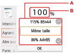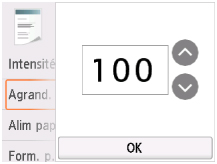 L'écran ci-dessous s'affiche lorsque vous sélectionnez Paramètres sur l'écran d'attente de copie, puis Agrand. pour sélectionner la méthode de réduction ou d'agrandissement. Spécifiez l'agrandissement et sélectionnez OK.