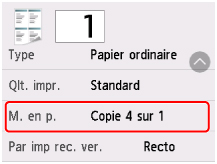 Sélectionnez Paramètres dans l'écran d'attente de copie pour afficher l'écran des paramètres d'impression, sélectionnez Copie 4 sur 1 pour M. en p., puis OK.