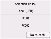 Dans le cas d'un ordinateur connecté à l'aide d'un câble USB, sélectionnez Local (USB) ; pour un ordinateur connecté au réseau, sélectionnez l'ordinateur vers lequel transférer les données numérisées.