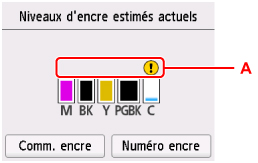 Niveaux d'encre estimés.Un symbole s'affiche dans la zone A en cas d'informations sur le niveau d'encre restant.