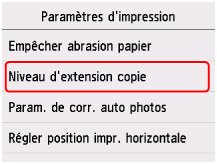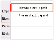Cette section présente la procédure à suivre pour modifier les paramètres à partir de l'écran Paramètres périphérique. L'option Niveau d'extension copie est utilisée comme exemple.