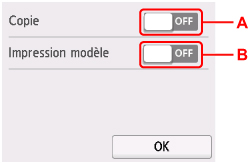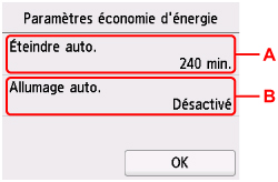 B : Si vous sélectionnez Activé, l'imprimante est automatiquement mise sous tension lorsqu'une commande de numérisation d'un ordinateur ou des données d'impression sont envoyées à l'imprimante.