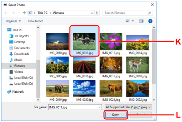 Klicka på foton (K) som du vill skriva ut och välj Öppna (Open) (L).