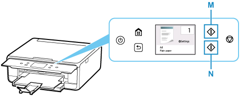Kontrollera pappersinställningarna och tryck på knappen Svart (Black) (M) eller Färg (Color) (N).