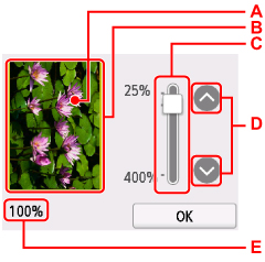 C: Förstoringsgraden som angavs i förhandsgranskningsfönstret visas. Om du har valt en annan inställning än Anp till sida (Fit to page) kan du ändra förstoringsinställningen genom att dra fältet på pekskärmen.
