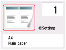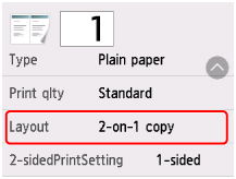 Välj Inställningar (Settings) på skärmen för vänteläge för kopiering för att visa skärmen med utskriftsinställningar, välj 2-på-1-kopiering (2-on-1 copy) för Layout och välj sedan OK.