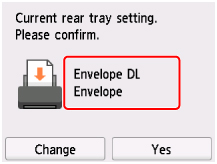 Om sidstorlek och medietyp som visas på pekskärmen matchar storlek och typ för de kuvert som fyllts på i det bakre facket väljer du Ja (Yes).