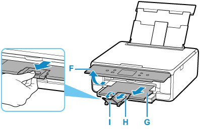 Öppna manöverpanelen (F), dra sedan ut utmatningsfacket (G) och pappersutmatningsstödet (H) och öppna sedan utmatningsfackets förlängningsdel (I).