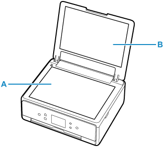 Använd en mjuk, ren, luddfri och torr trasa. Torka försiktigt av glasskivan (A) och insidan av dokumentluckan (den vita ytan) (B). Kontrollera att inga rester finns kvar efter rengöringen, i synnerhet inte på glasskivan.