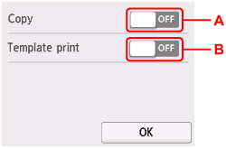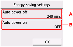 B: När PÅ (ON) markeras startas skrivaren automatiskt när ett skanningskommando från en dator eller när utskriftsdata skickas till skrivaren.