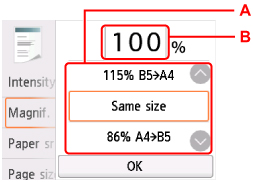 Значення параметра Збільш. (Magnif.): 70% A4->A5/86% A4->B5/94% A4->LTR/115% B5->A4/141% A5->A4/156% 5x7->LTR/183% 4x6->LTR