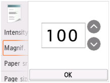 Наведений нижче екран відображається, якщо на екрані режиму очікування копіювання вибрати елемент Параметри (Settings), а потім — Збільш. (Magnif.), щоб установити метод зменшення або збільшення. Відрегулюйте параметр збільшення й натисніть кнопку OK.