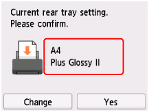 Jeśli rozmiar strony i typ nośnika wyświetlone na ekranie dotykowym są zgodne z rozmiarem i typem papieru załadowanego na tylną tacę, wybierz opcję Tak (Yes).