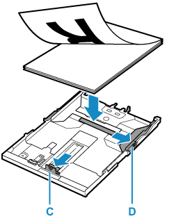Aliniaţi ghidajele pentru hârtie (C) spre partea frontală şi (D) spre dreapta cu lungimea şi lăţimea hârtiei.