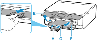 8. Öppna manöverpanelen (E), dra sedan ut utmatningsfacket (F) och pappersutmatningsstödet (G) och öppna sedan utmatningsfackets förlängningsdel (H).