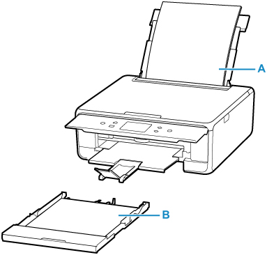 Skrivaren har två papperskällor som matar papper: det bakre facket (A) och kassetten (B).