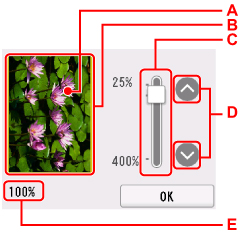 C:显示预览屏幕显示时所设置的缩放设置。 如果选择除按页面大小以外的设置,可以通过拖动触摸屏上的滑动条更改缩放设置。
