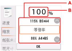 缩放中设置: 70% A4->A5/86% A4->B5/94% A4->LTR/115% B5->A4/141% A5->A4/156% 5x7->LTR/183% 4x6->LTR
