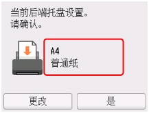 关闭进纸插槽盖板后,触摸屏上会显示后端托盘的纸张设置确认屏幕。
